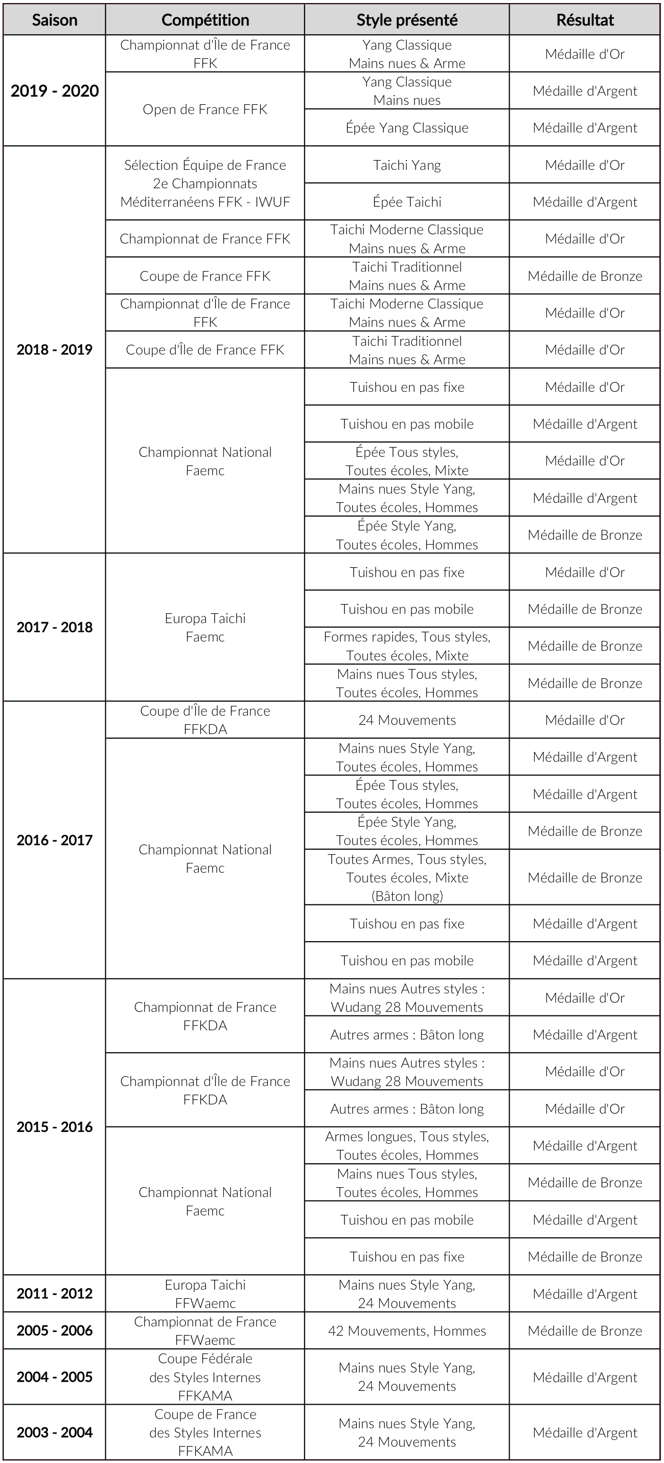 Il est titulaire du Certificat de Qualification Professionnelle Arts Martiaux option Taichi Chuan depuis 2011, obtenu auprès de la FFWaemc, Fédération Française de Wushu et arts énergétiques et martiaux chinois et pratique les styles Yang et Wudang.